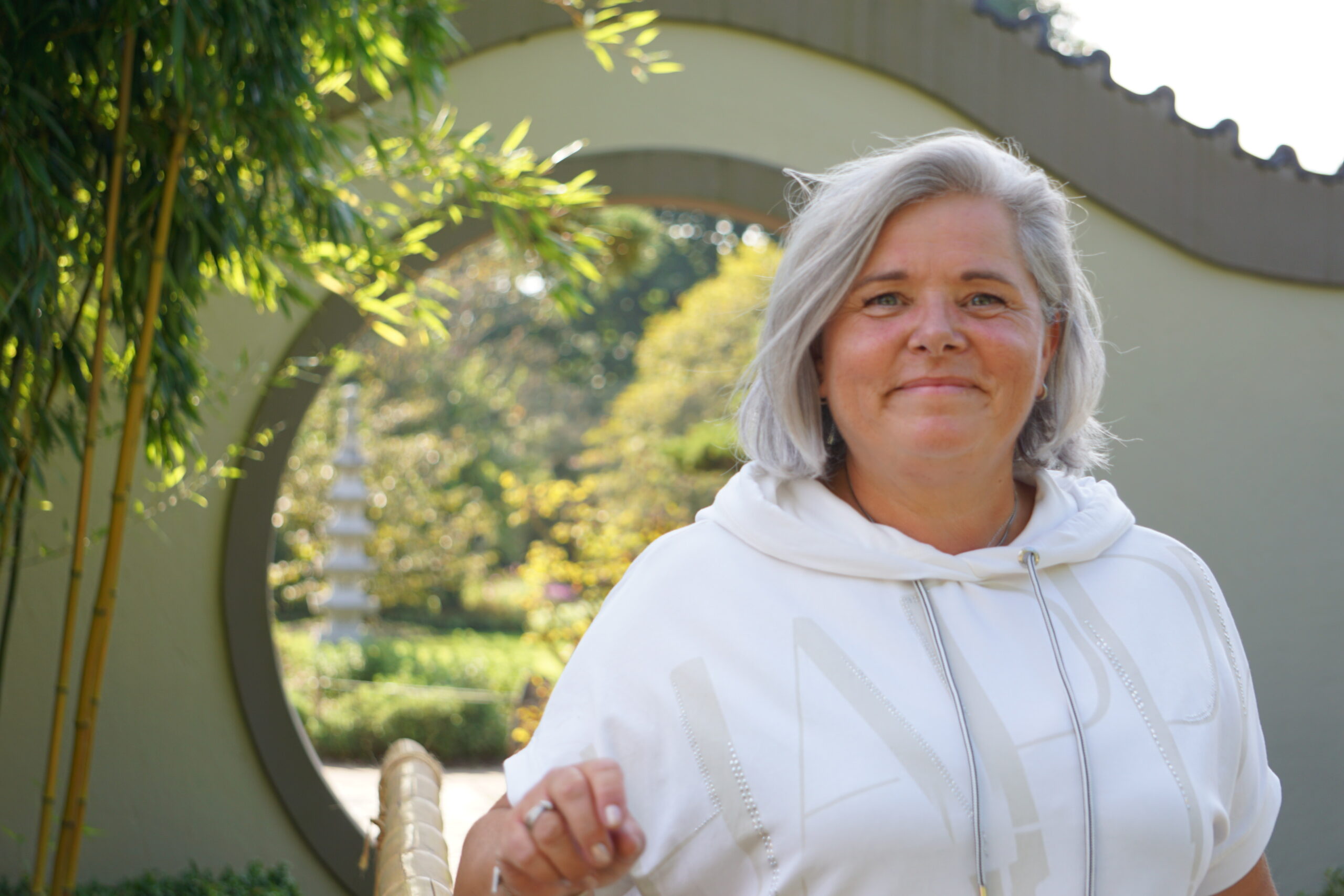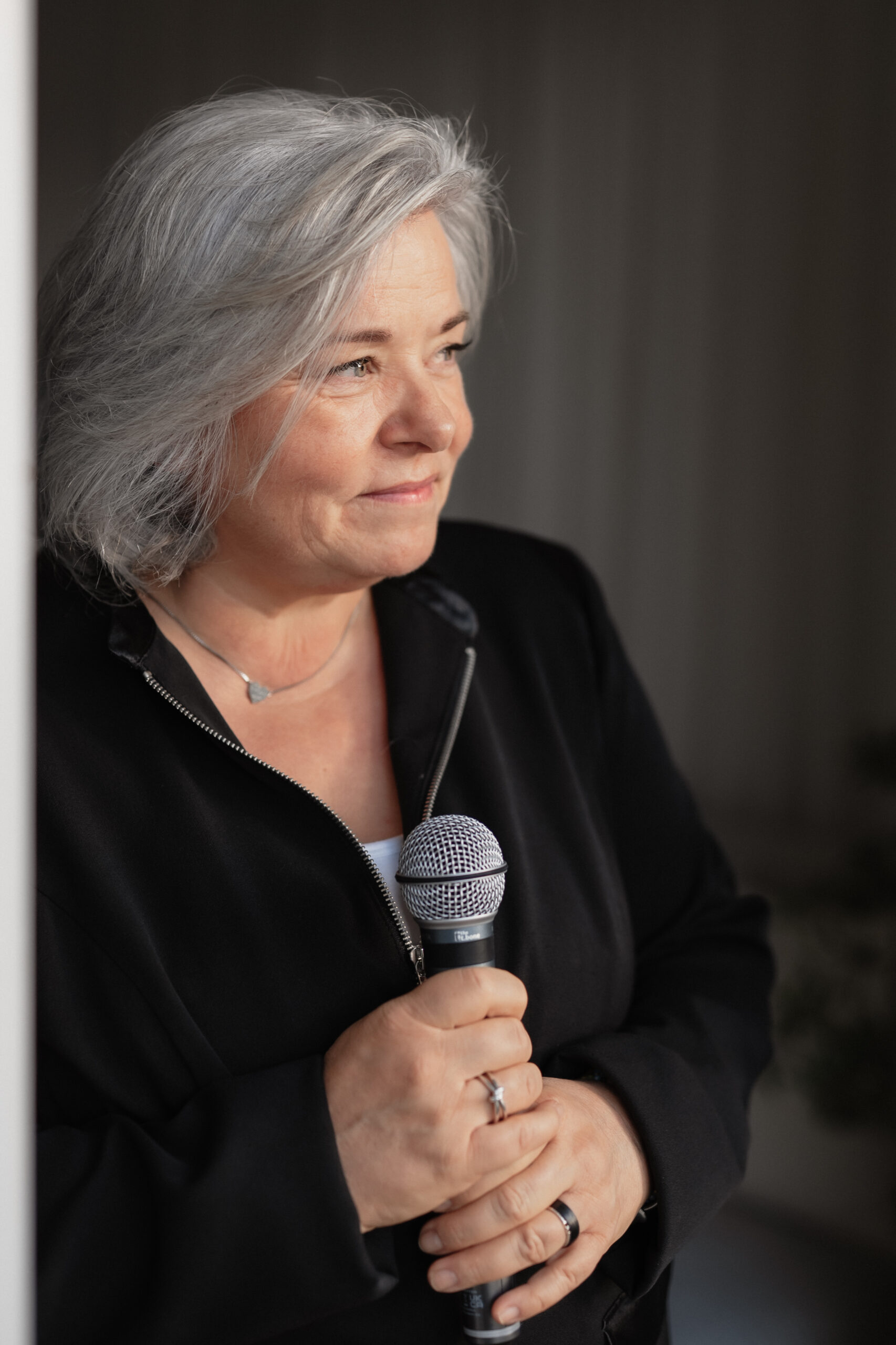Lächelnde Frau mittleren Alters mit grauen Haaren, die ein blaues Oberteil und eine rosa Jacke trägt, hält ein Mikrofon in beiden Händen und steht neben einem weißen Vorhang in einem hellen Raum.